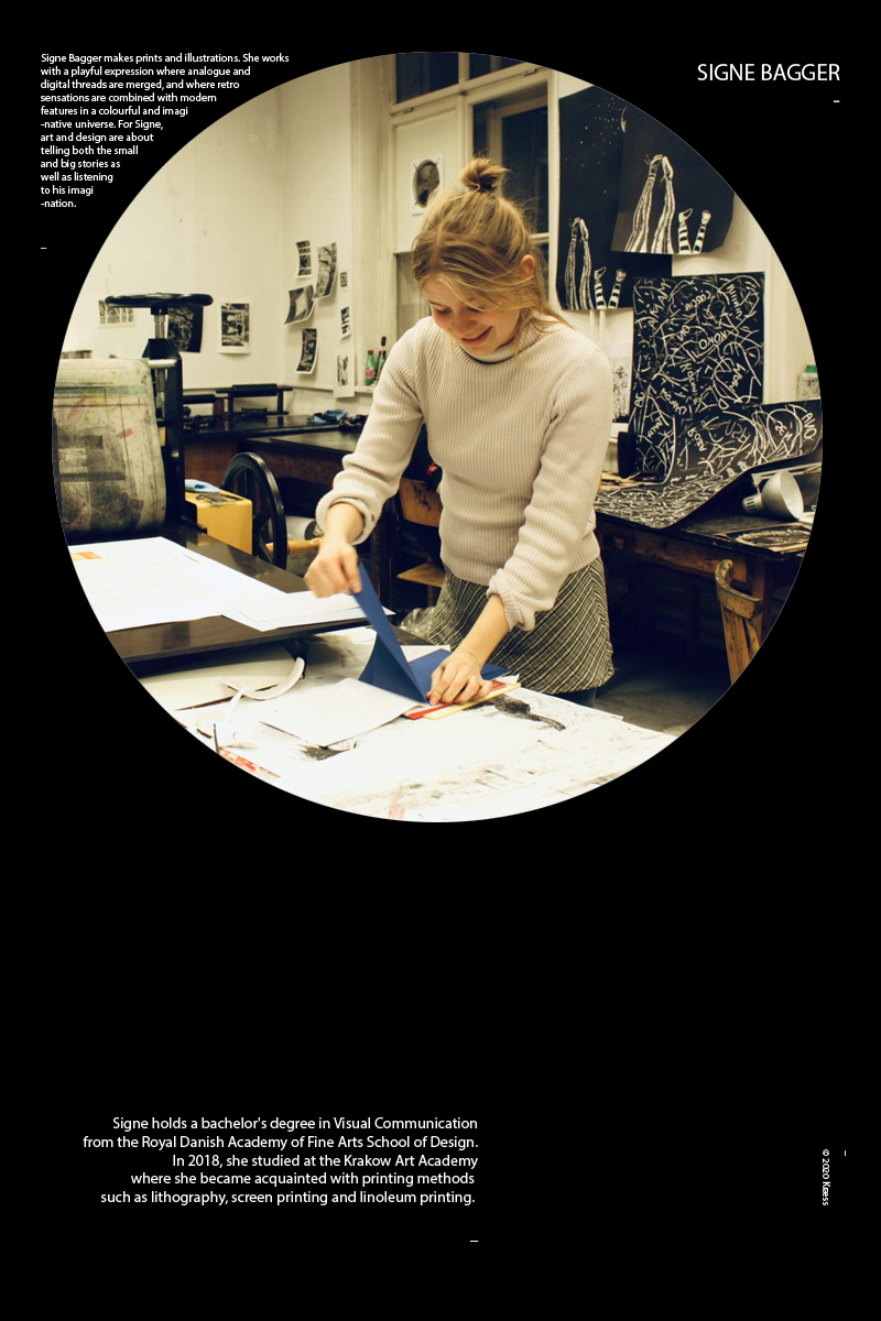 Signe Bagger는 프린트와 일러스트 작가입니다. 그녀는 아날로그와 디지털, 레트로와 모던,현실과 상상력의 경계에서 화려한 색채와 상상력의 세계를 구축합니다. Signe은 왕립 덴마크 미술 아카데미 디자인 스쿨Royal Danish Academy of Fine Arts School of Design에서 시각 커뮤니케이션을 전공한 후 2018 년 크라쿠프 예술 아카데미에서 리소그래피, 스크린 인쇄 및 리놀륨 인쇄술을 익힙나디. Signe에게 예술과 디자인은 그녀의 상상력을 통해 거대담론과 소소한 이야기를 동시에 전달하는 작업입니다.