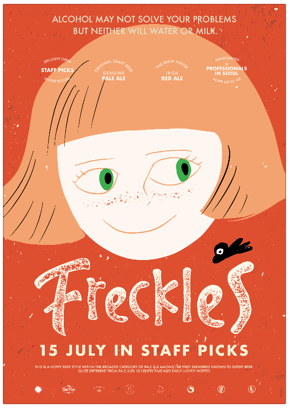 Description: 창백한 피부와 빨강머리의 주근깨 소녀, 아이리시 레드 에일 론칭 포스터
