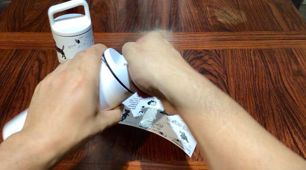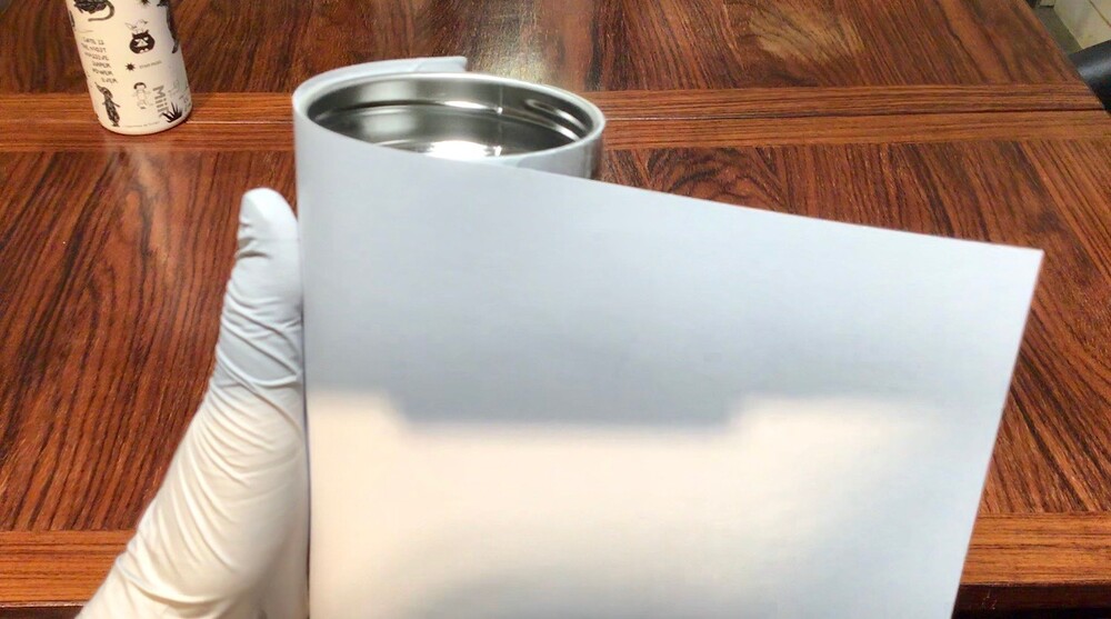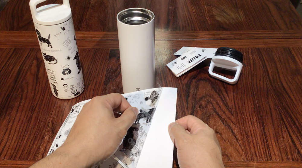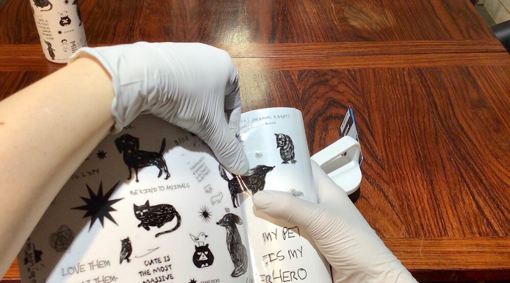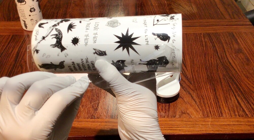 이제 텀블러에서 그림만 남기고 투명비닐을 뜯어내는 단계입니다. 아주 조심스럽게 차분히 벗겨내야 합니다.