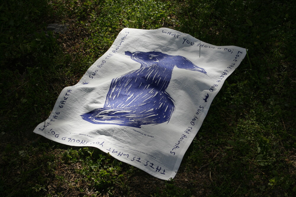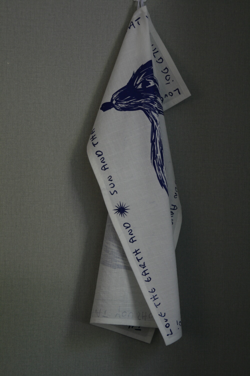 실크스크린 방식으로 소량 제작된 판화로 종이 대신 면직물에 인쇄하여 액자에 들어가기 보다는 자연스럽게 걸 수 있도록 고리를 달았습니다.